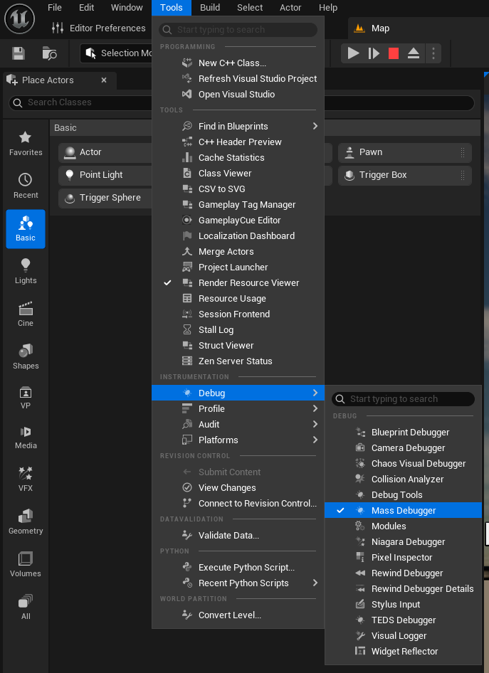 Load the Unreal editor and create an instance of AMassEntitySpawner.