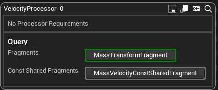 We need mutable access to FMassTransformFragment and access to the const shared FMassVelocityConstSharedFragment.