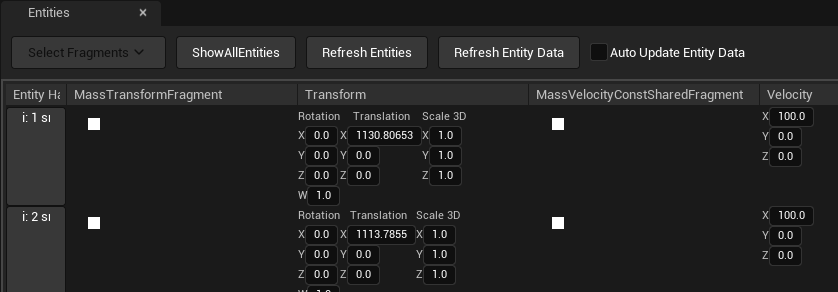 Now we’ll use our entity spawner and view the fragment data in the Mass debugger (see overview).